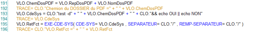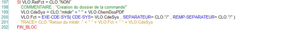 Un client souhaite créer un dossier par commande fournisseur avec tous les fichiers la concernant à l’intérieur. | mkdir | ![]() La commande système sera donc mkdir [chemin absolu du dossier] | Dans ce cas, la fonction retourne “*CDE-PB” suivi du libellé de l’erreur : ![]() Ou la liste chaînée des résultats dans le cas contraire : ![]() |