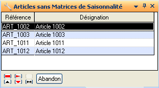 Liste détaillée des articles liés à la matrice de saisonnalité en fonction du niveau sur lequel l'utilisateur est positionné et non pris en compte par le calcul avec pour colonnes :