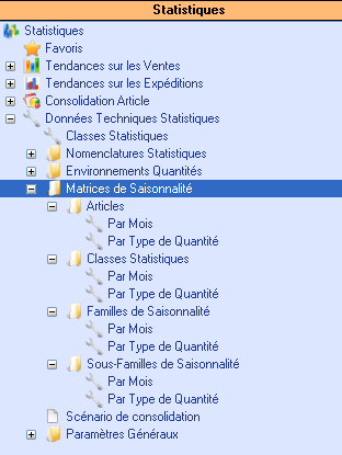 Quel que soit le niveau, la gestion d'une matrice de saisonnalité s'effectue par la même application. Seule la liste diffère selon la présentation sélectionnée par l'une des deux branches disponibles dans chacun des niveaux :