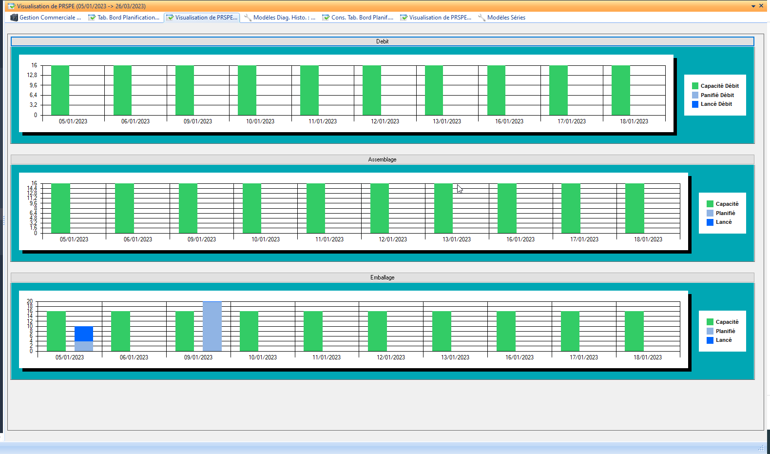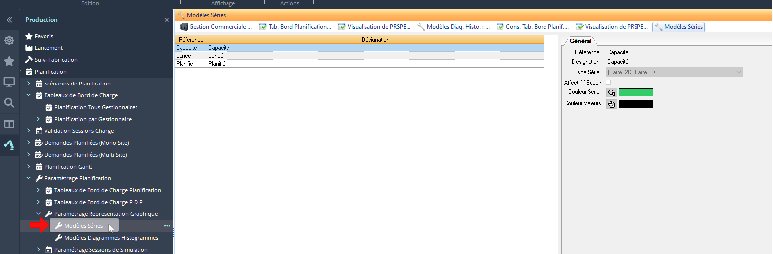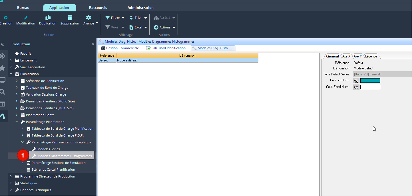Pour cela on va dans 🏠 Production>Planification>Paramétrage Planification>Paramétrage Représentation Graphique>Modèles diagrammes historiques.