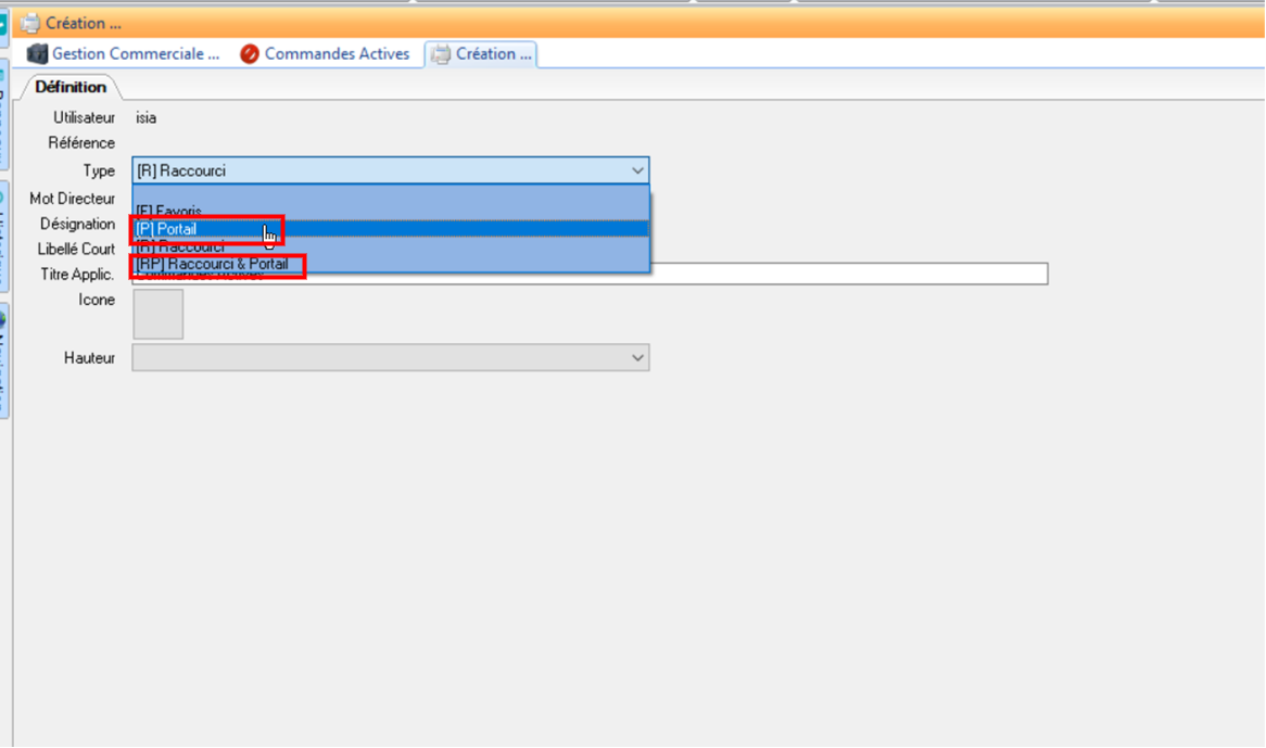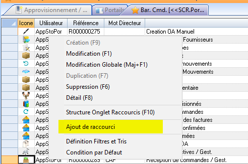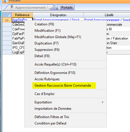 Modifier un raccourci dans la barre de commande du Portail