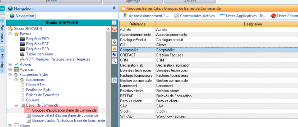 STUDIO : Apparences Styles → Barre de Commande → Groupes d’application Barre de commande