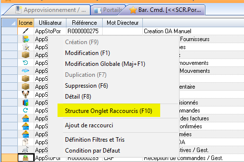 Cliquez ensuite sur “Gestion Raccourcis Barre Commande” :