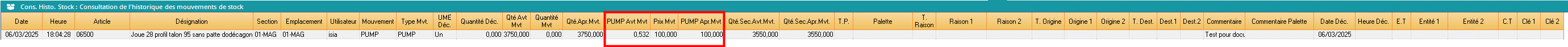 PUMP après mvt = ( (Stock global avant mouvement * PUMP avant mouvement ) + (Quantité mouvement * Prix mouvement) ) / Stock global après mouvement