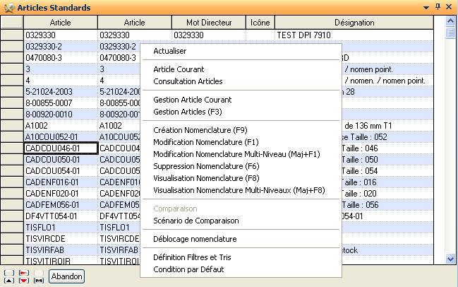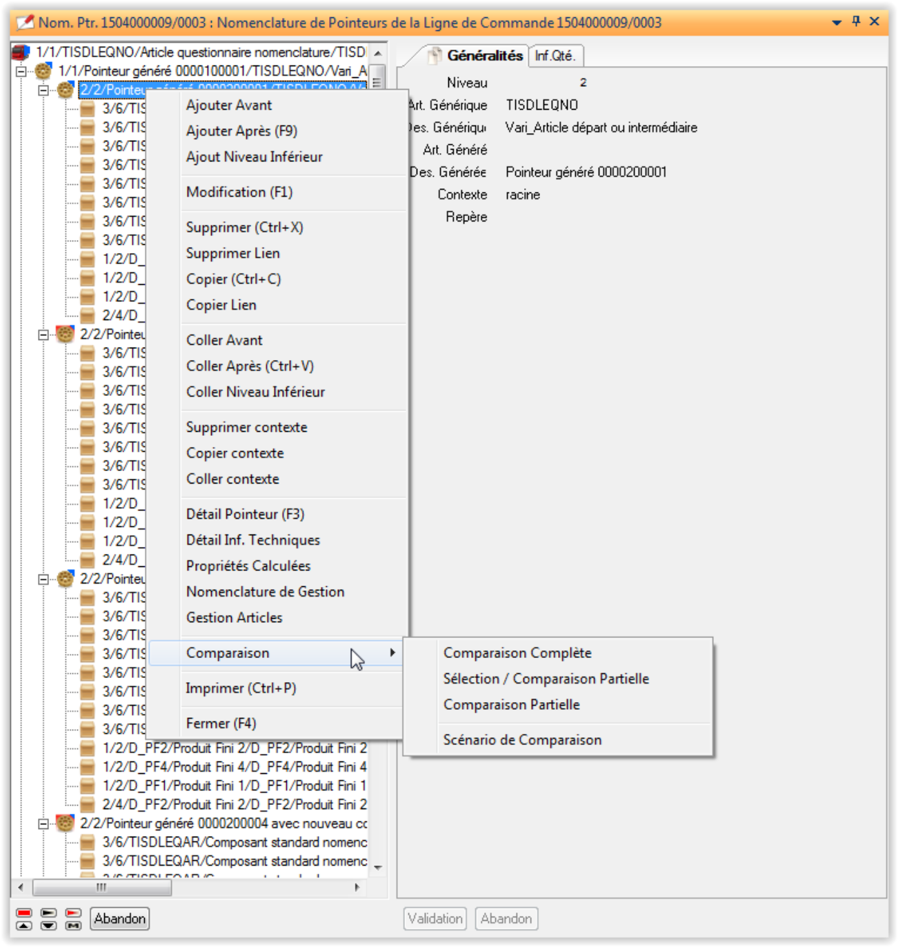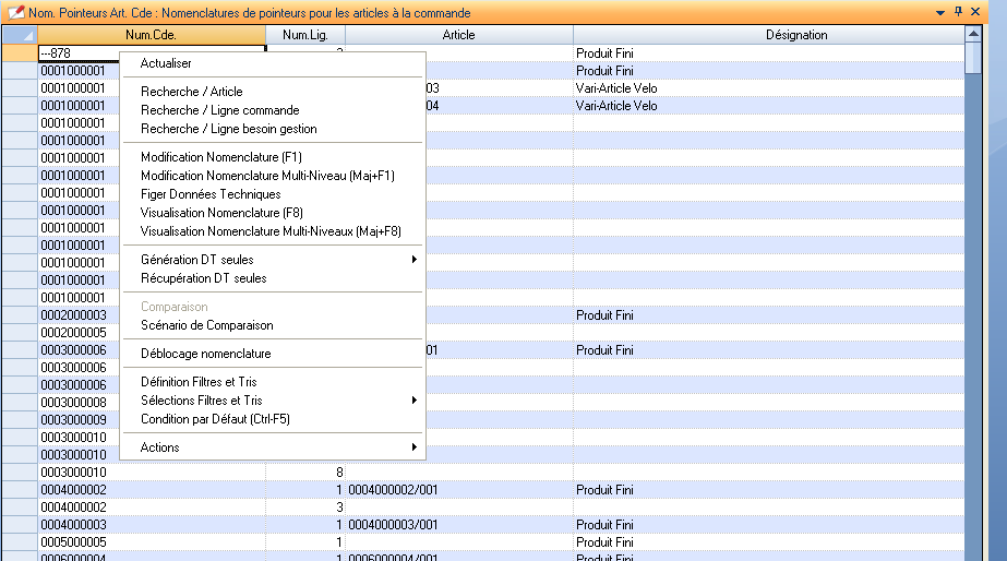 Pour les articles standards ou pour les lignes de commandes, le menu contextuel de la nomenclature permet d’obtenir les mêmes options :