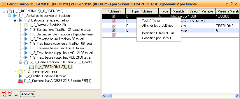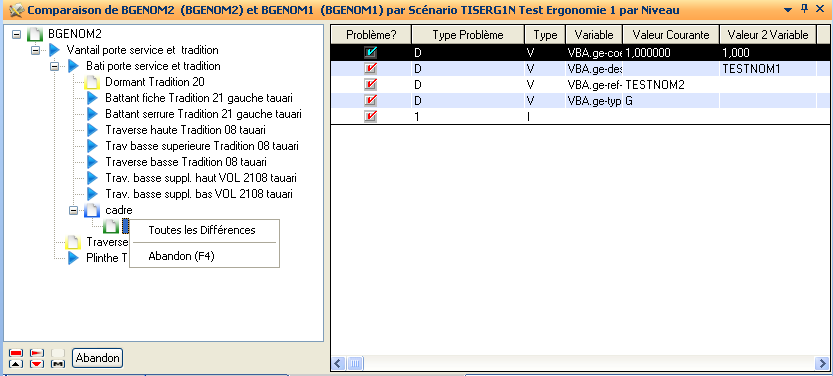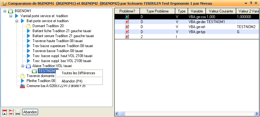 Comparaison complète des 2 nomenclatures sélectionnées en fonction du scénario courant.