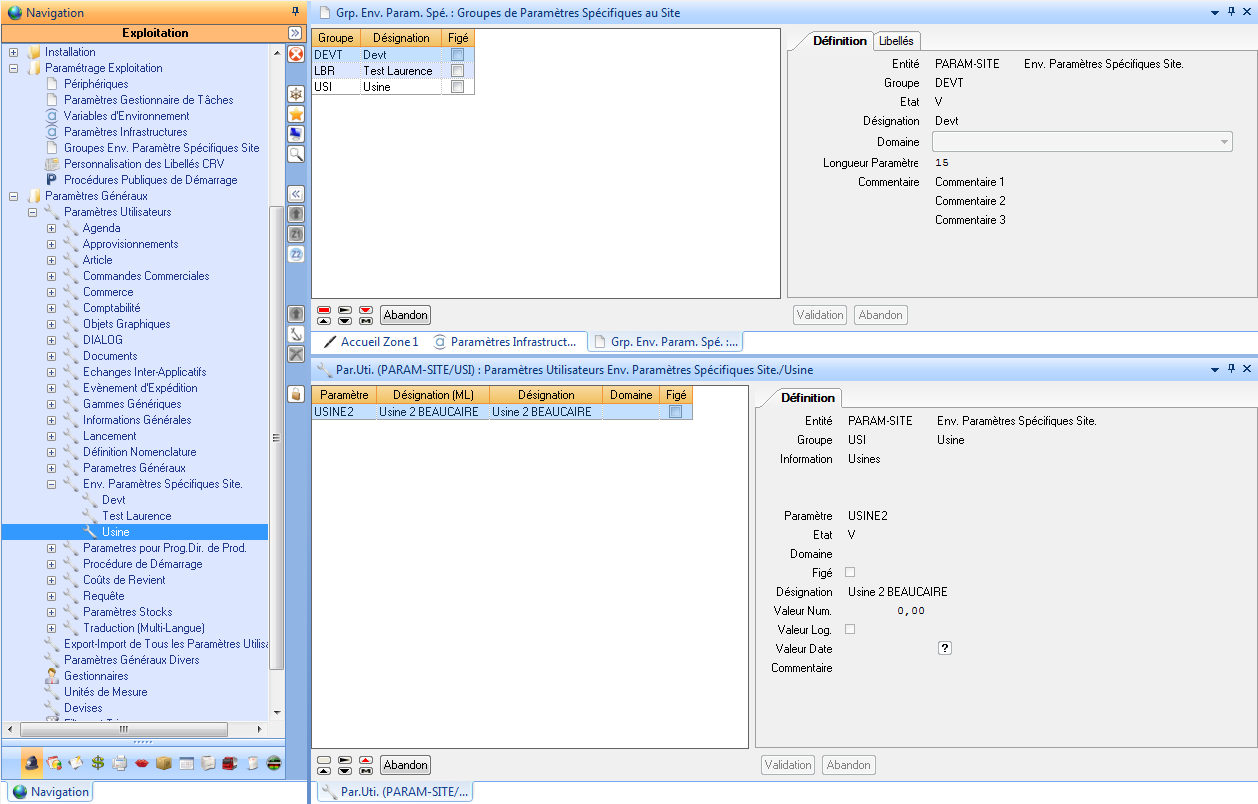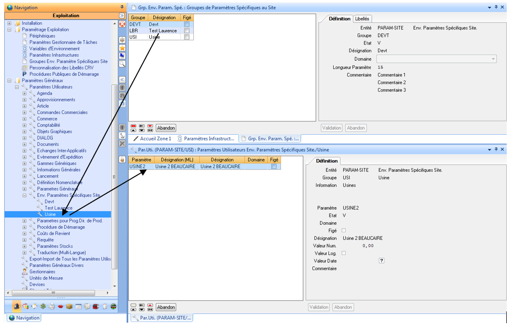 La copie d’écran ci dessus montre le chemin d’accès à l’application de définition des groupes de paramètres site et présente aussi l’application de gestion des paramètres disponible dans la branche « Paramètres Utilisateurs » et dont le libellé est « Env. Paramètres Spécifiques Site ».