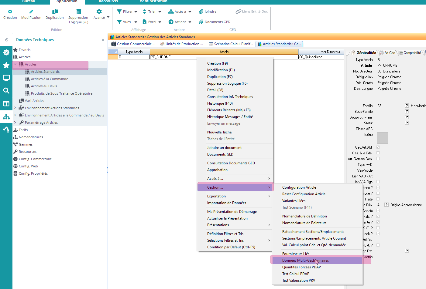 Il ne reste plus qu'à aller sur le/les articles pour lesquels on a des données différentes en fonction des sites ! Pour cela on va sur l’article, clic droit Accès>Données Multi-Gestionnaire.