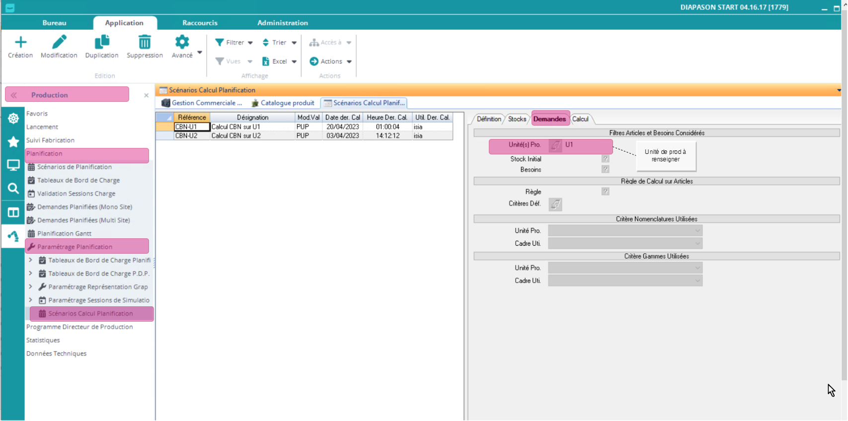 On renseigne l’unité de production sur l’onglet Demandes