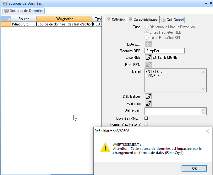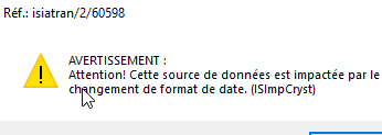 Lors de mise à jour de ce champ, si la source de données contient un Champ « Date », une alerte prévient qu’une modification du rapport Crystal Reports® peut être nécessaire pour mettre à jour le format d’affichage des champs de type « Date ».