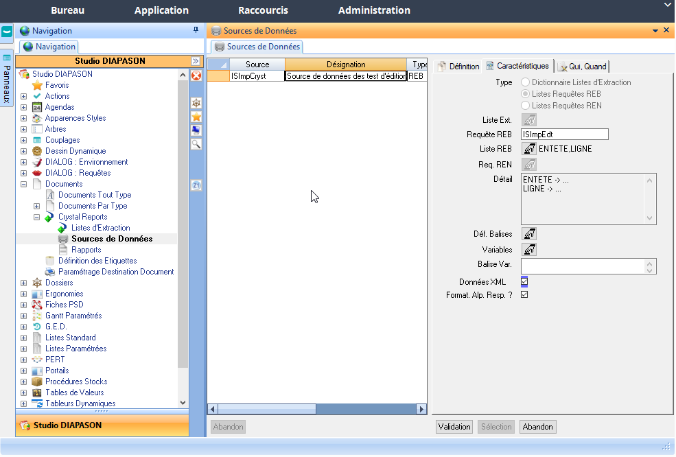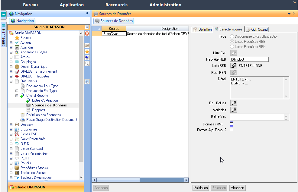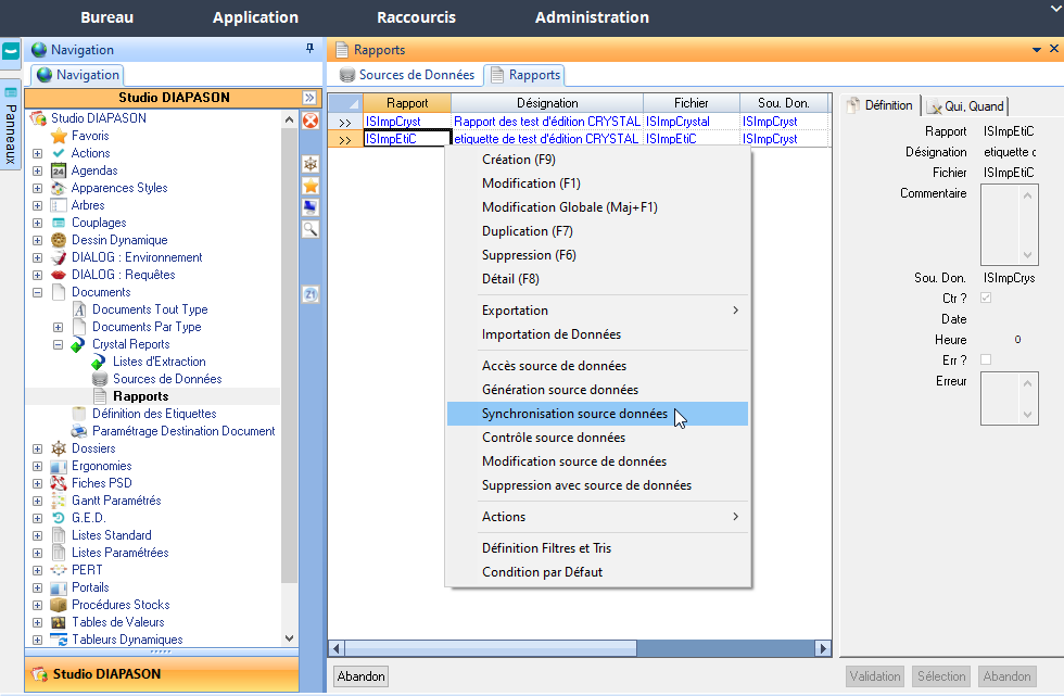 Après avoir migrer une édition Crystal Reports® du mode « XML » vers le mode « Dataset », il est nécessaire de lancer l’action « Synchronisation Source de données » depuis les rapports utilisant la source de données courante.
