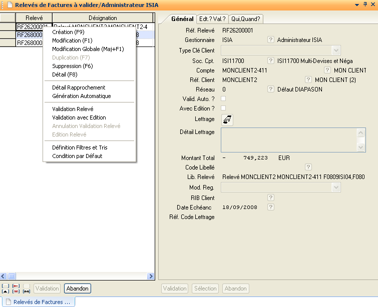 Valide le(s) relevé(s) sélectionné(s). Cette action est disponible uniquement depuis la branche « Relevés de Factures à valider ». La validation de relevés ne génère pas d’écritures comptables, par contre si le mode de règlement du relevé fait partie de la liste des modes de règlements automatique (paramètre LIS-MOD-REGEFF), un règlement par effet est automatiquement généré à partir du scénario défini sur la société comptable (voir Gestion des sociétés comptables). Une trace affiche les résultats de cette validation indiquant si les validations sont un succès ou dans le cas contraire le code et le libellé de l’erreur.