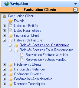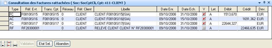 Lance une liste affichant la liste des factures non lettrées (ou non rattachées) du client. Il est donc possible d’effectuer une sélection des éléments voulant être regroupés sous un même relevé.