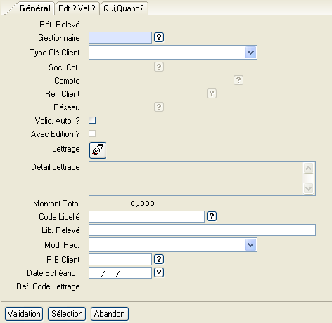 Date d’échéance, selon l’état du paramètre général « RELEVE-ECH », elle sera initialisée au plus tôt ou au plus tard parmi les factures sélectionnées.