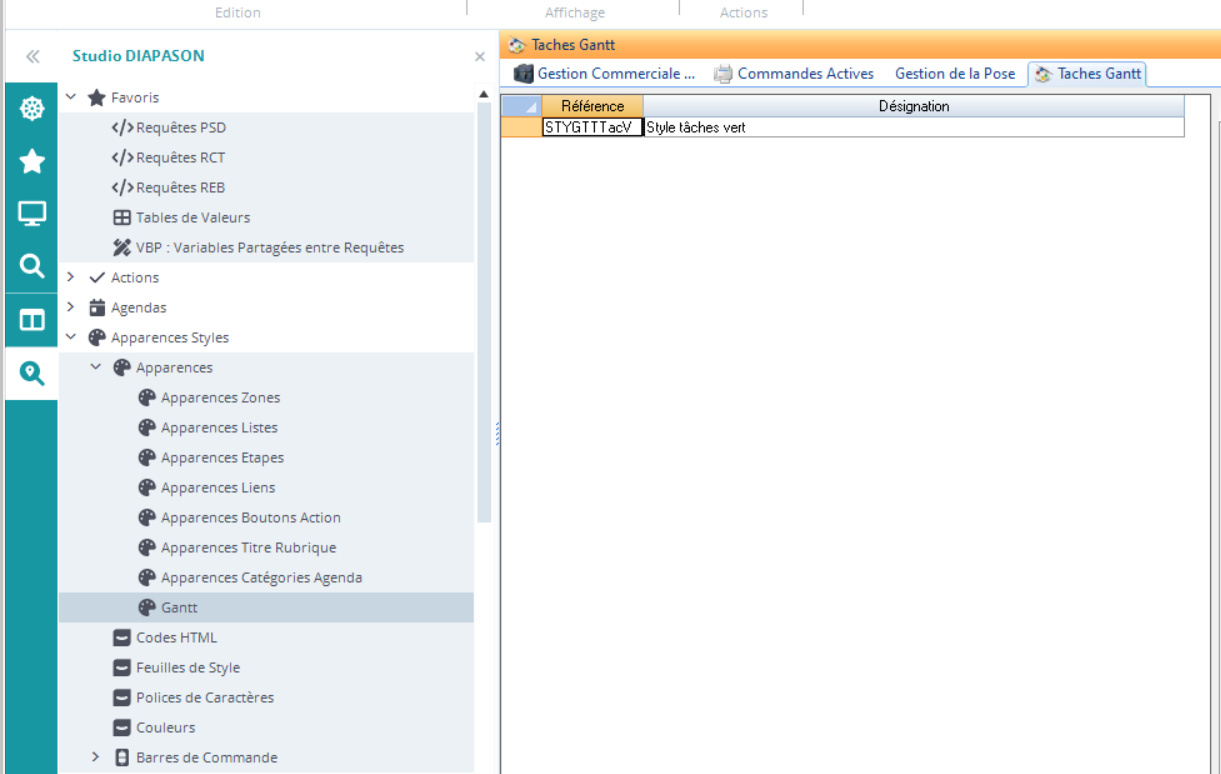 tous les aspects globaux du gantt correspondant aux données du formulaire du GANTT: affichage des info-bulles, titre, calendrier, couleur des tâches… Toutes ces données peuvent être initialisées ou complétées par la requête en mode DEM