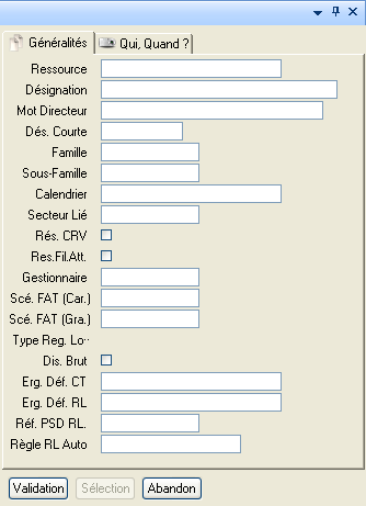 Les références familles présentées sont stockées dans l’explorateur Paramètres Généraux -> Paramètres Utilisateurs -> Gammes Génériques -> Familles Ressources (Entité : GAMME ; GROUPE : FamRess).