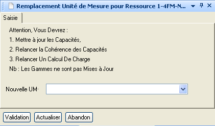 Exemple : deux machines 1 et 2 sont gérées avec la même unité de temps CH (centième d'heure). Une troisième machine "fictive" 3 gérée avec la même unité de temps CH exprimera le cumul des capacités des ressources des machines 1 et 2..