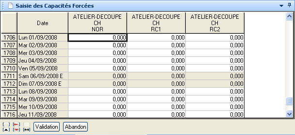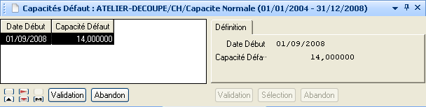 L’action Capacités/Défaut permet de définir pour des périodes données les valeurs des capacités des triplets « Ressource-unité de charge-détail de capacité ».