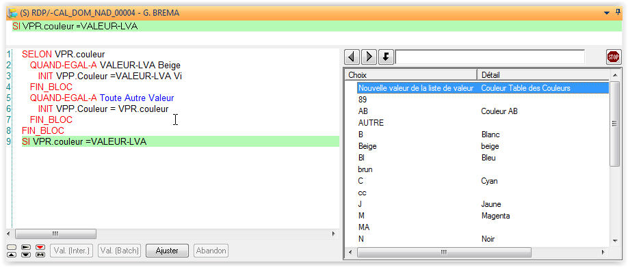 EXEMPLE Dans l'exemple suivant, si la couleur est Bleu, entrée dans le premier bloc d'instructions, sinon entrée dans le deuxième.SI VLO.Couleur = CLO."Bleu" ...SINON ...FIN_BLOC