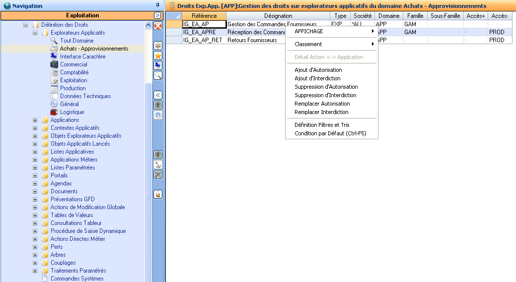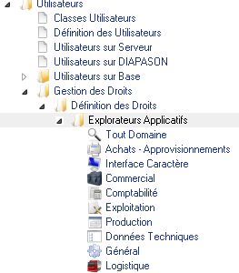 L'applicatif de gestion de droits se trouve dans l’explorateur applicatif d'Administration générale, menu Application : exploitation, dossier Utilisateurs, sous-dossier Gestion des droits, sous-sous-dossier Définition des droits.
