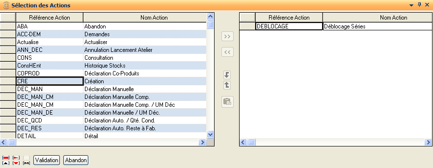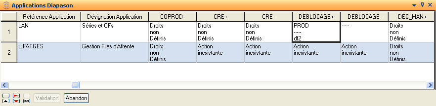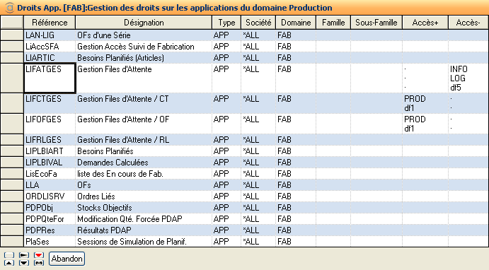 Dans l'exemple ci-dessus, l'utilisateur a autorisé l'action Accès en Consultation sur l'application Séries &OFs pour la classe PROD et l'utilisateur df1.