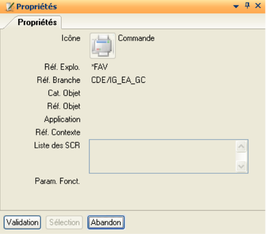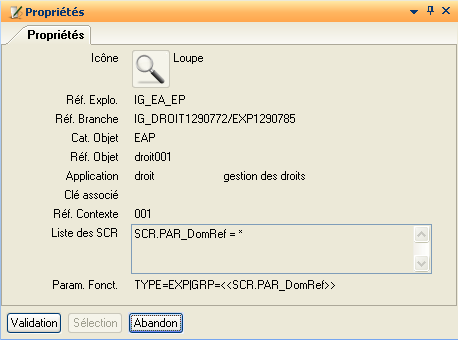 Remarque : Pour chaque application, une variable standard critère (SCR), correspondant à la clé de l’application a été rattachée à celle-ci. Le nom de cette variable est donné dans la fenêtre présentant les propriétés d’une branche d’explorateur applicatif.