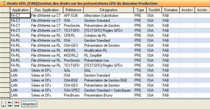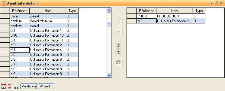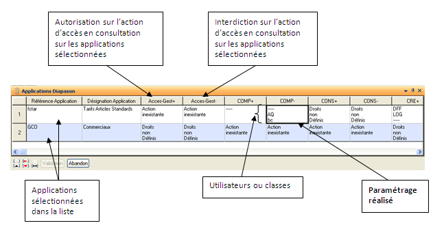 Les Colonnes Acces+ et Acces- permettent de visualiser les droits (utilisateurs) déjà attribués pour les objets du critère sélectionné.