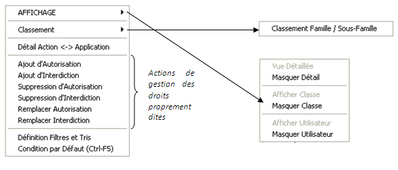 Les actions de gestion des droits proprement dites sont disponibles sur ce tableur : Ajout Autorisation/Interdiction, Suppression Autorisation/Interdiction, Remplacer Autorisation/Interdiction.