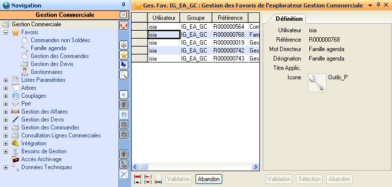 Cet explorateur présente donc le regroupement des favoris définis par un utilisateur dans chaque explorateur sous forme d'un nouvel explorateur ouvert automatiquement dans le panneau de Navigation (sauf si l’utilisateur n’a accès qu’au Navigateur dans son thème).