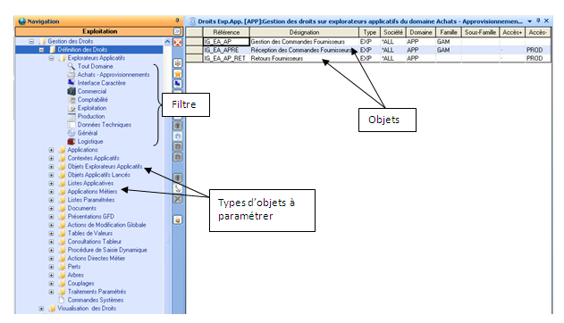 Lancer l'application de gestion des droits. Sélectionner le type d'objet souhaité, un classement par domaine permet de réaliser un filtre de sélection.