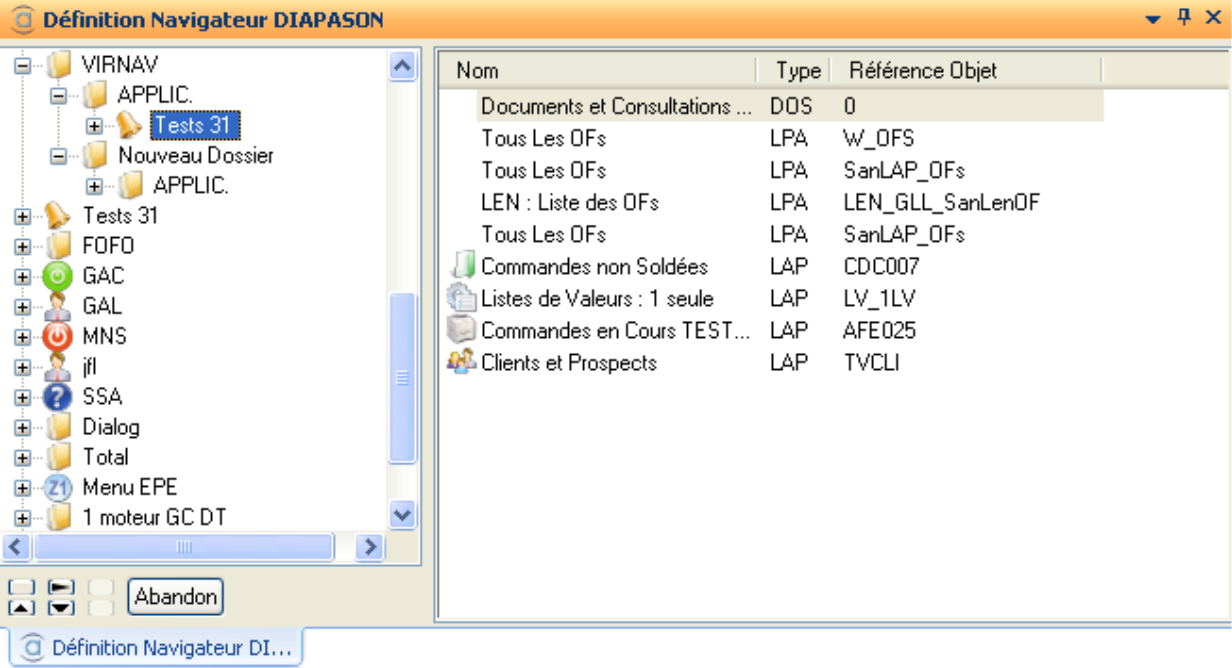 Cette application permet de définir l’arborescence du Navigateur DIAPASON. Il n’existe qu’une seule arborescence pour toutes les sociétés et tous les utilisateurs. Toutefois, l’administration des objets ne concerne que la société courante. De plus, on peut limiter la visibilité d’un utilisateur en déterminant les points d’entrée de chaque utilisateur/Sociétés.