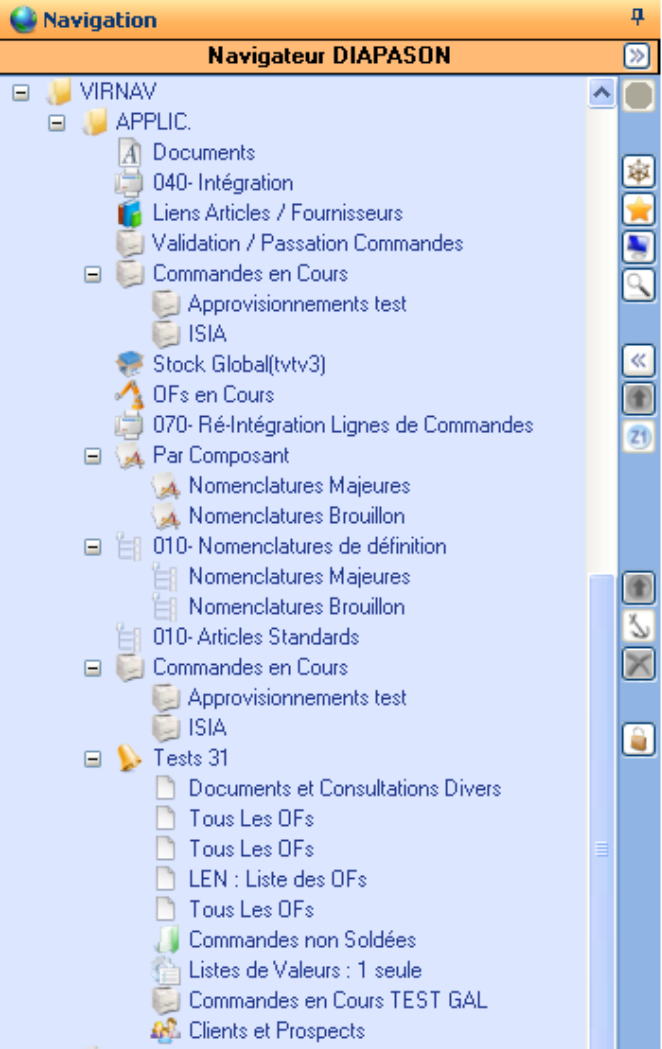 Le panneau de navigation permet d’accéder à tous les explorateurs DIAPASON, à l’explorateur « Mes Favoris », à l’explorateur « Supervision » ainsi qu’au « Navigateur » pour permettre de lancer les applications de DIAPASON.