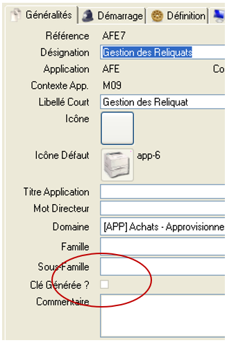 - Référence : elle est générée avec la référence application et un compteur sur 3 chiffres. Non modifiable.