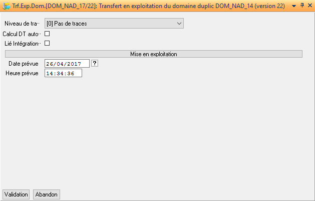Traitement permettant de rendre un paramétrage actif pour les calculs futurs. Ce traitement permet d’effectuer le transfert à une date et heure données. Cette action n’est disponible que sur les domaines en développement et ayant été générés sans erreur.