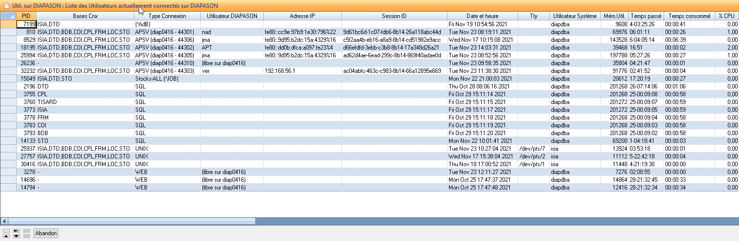 Utilisateur DIAPASON: Utilisateur DIAPASON ; pour les sessions caractères, cette information est vide ; il faut se reporter à la colonne « Utilisateur système » pour connaître le nom de l’utilisateur DIAPASON.Cas particuliers :
