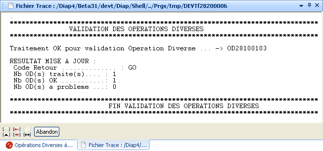 La validation d’OD permet de passer le statut de l’entête d’OD à « Validée » et de générer les écritures comptables correspondantes au lignes d’écriture de l’OD, qui seront en attente de confirmation administrative (Voir chapitre Confirmation). Cette action n’est disponible que depuis l’application des opérations diverses à valider. En retour de l’action, une trace d’exécution est affichée, si il y eu une erreur lors de la validation, le libellé de cette erreur est affiché, et l’OD n’est pas validée.