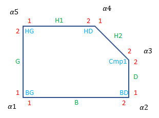 Ci-dessous des schémas précisant la codification des différents éléments des formes pentagones.