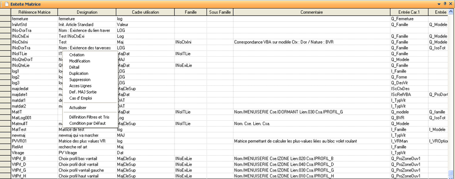 Une matrice manuelle se compose d’un entête qui définit le cadre d’utilisation de la matrice ainsi que les contraintes d’entrées de la matrice à savoir les variables entrant en jeu dans la condition et de détails où sont répertoriés tous les cas possibles.