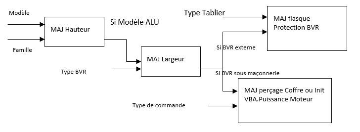 La hauteur est initialisée en fonction de la VBA.famille et de la VBA.modèle et cela de façon systématique. Mais si le modèle est ALU et uniquement ALU, je dois faire une mise à jour sur la largeur et cela en fonction du fait qu’il y ait un BVR et suivant le type du BVR. Si le type BVR est sous maçonnerie et si la commande de ce BVR est électrique il faut alors initialiser la VBA.Moteur et si la commande est manuelle initialisation de la VBA.Percagecoffre.