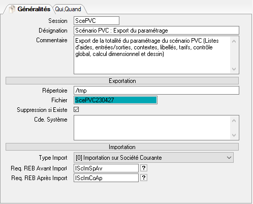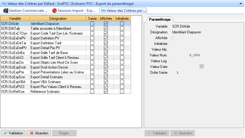 Par exemple, si on veut créer une session dédiée à l’export du paramétrage du scénario commercial PVC, nommer la session ScePVC ou ScePVC_Tot si on envisage de créer plusieurs sessions paramétrage commercial pour le même scénario.