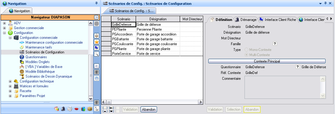 La définition d’un scénario se fait à partir du Navigateur DIAPASON « Configuration è Configuration Commerciale è Scénarios de Configuration ».