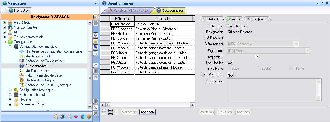 La définition des questionnaires se fait dans « Navigateur Diapason è Configuration è Configuration Commerciale è Questionnaires » :