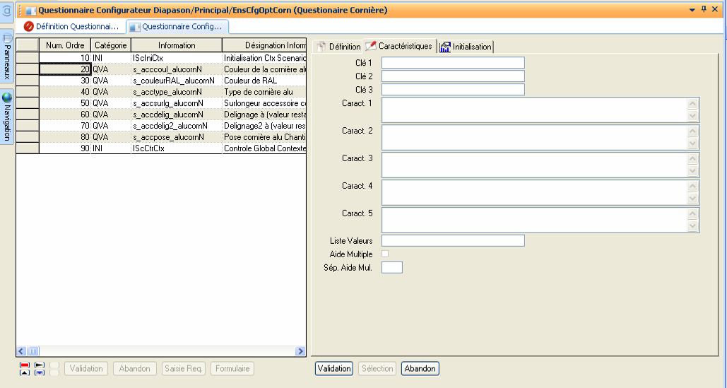 Un questionnaire permet de définir l’enchaînement des questions (variables de base VBA) ou des requêtes : Accès Questionnaire (F10).