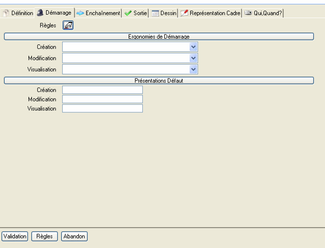 L’onglet « Démarrage » permet de spécifier la requête qui va être exécutée en début de scénario (IScDemSce), les ergonomies de démarrage ainsi que les présentations défaut :