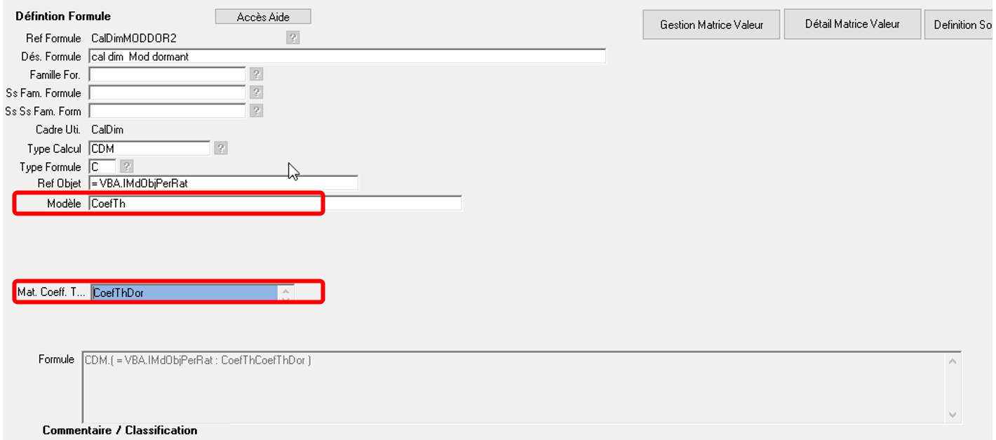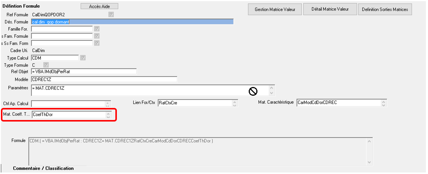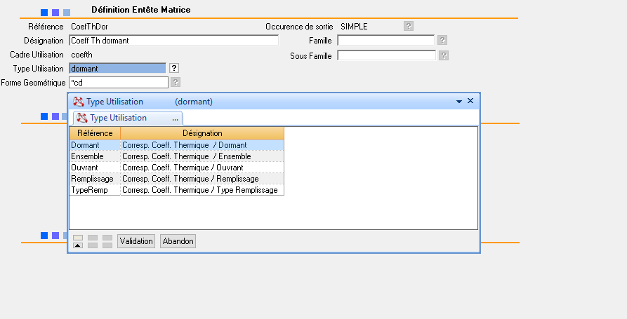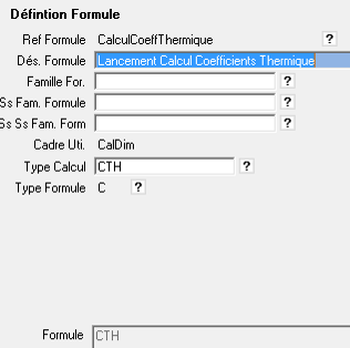 Les clés de renforts et clés de compléments thermiques peuvent être initialisées lors du calcul dimensionnel (création et modification) de chaque objet lié à des géométries. Ces clés doivent être définies via un type de matrice dédiée (matrice de coefficient thermique, cadre utilisation : coefth) devant être rattaché à la formule de calcul dimensionnel.