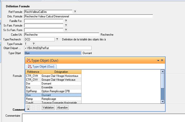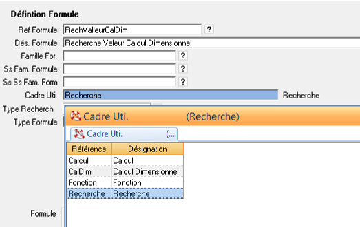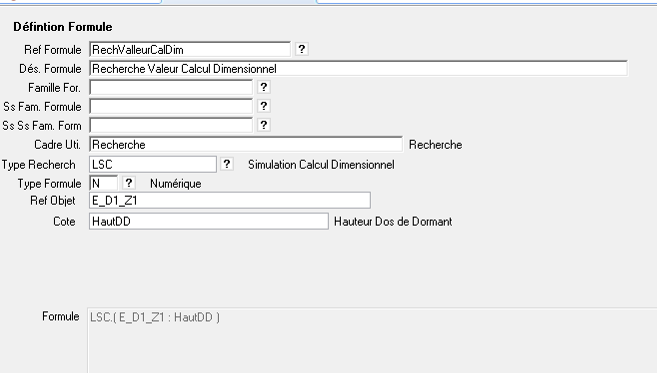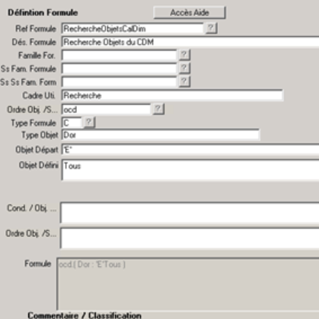 Les différentes recherches liées aux résultats de calcul dimensionnel d’un objet ou d’un type d’objet s’effectuent par l’intermédiaire de formules dont le cadre d’utilisation est « Recherche »