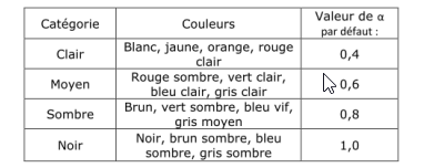 α est le coefficient d’absorption de la menuiserie selon sa couleur, à savoir :