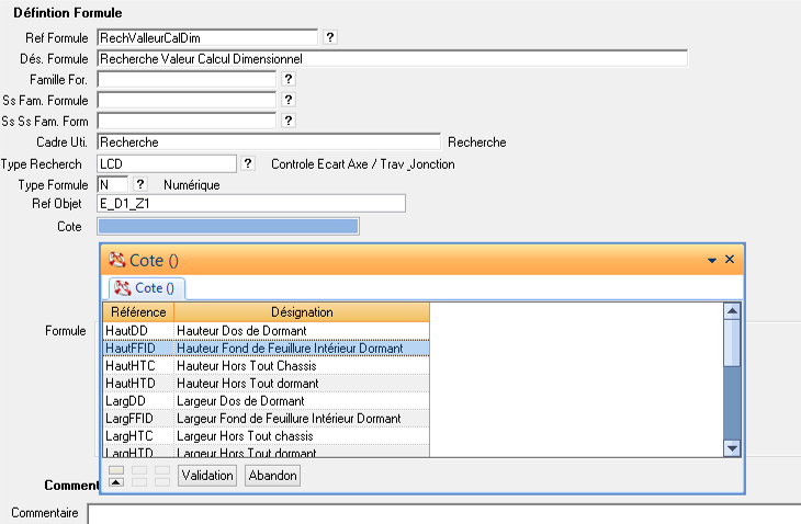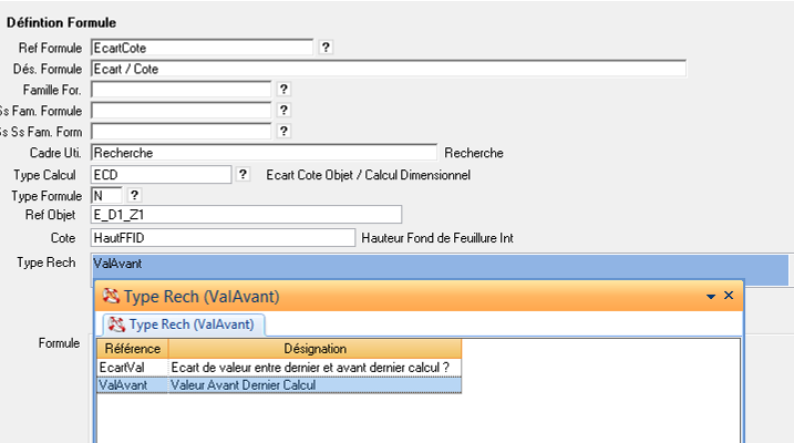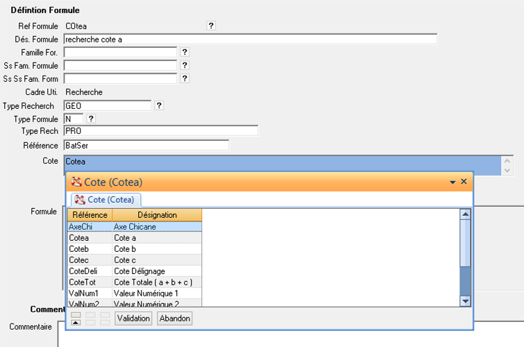 Cote : Référence de la caractéristique à récupérer. La liste d’aide proposée est lié au type de formule.