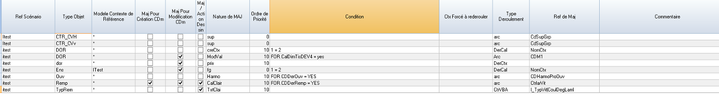 Nature de MAJ : Nature liée à la clé scénario/type objet /modele contexte. Seule la premiere condition valide d’une même nature, classée par N° Ordre sera traitée.