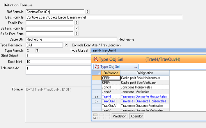 Ce type de formule a pour but de déterminer, lors du recalcule d’un objet, si la valeur saisie en critère de la formule à évoluer ou pas. Le périmètre d’utilisation de cette formule se limite à l’outil de déroulement des contextes après calcul d’un objet. Exemple suite au recalcule d’un Ouvrant, on souhaite savoir si la hauteur du vantail à évoluer afin de redérouler ou pas la question hauteur de poignée du contexte lié à l’objet modifié.
